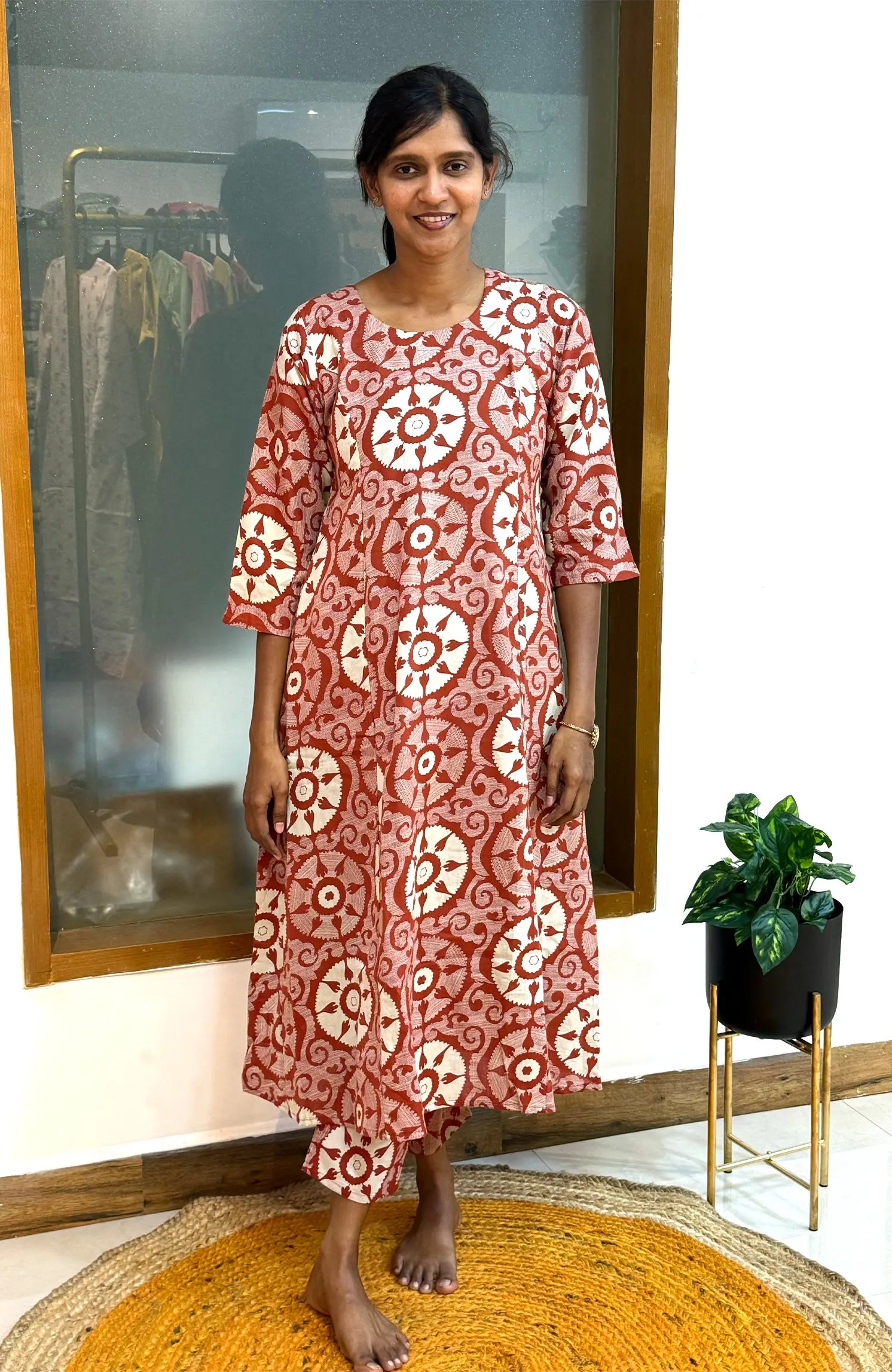 Elevate your everyday style with the Ajrakh Scene Rust 524B — a soft cotton set designed for absolute comfort and trend-forward casual wear. The A-line top with a convenient pocket paired with straight-fit pants creates a relaxed yet stylish look, enhanced with Ajrakh-inspired motifs in a rich rust tone.