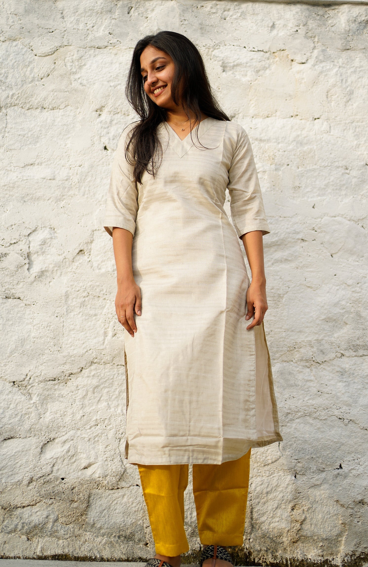 Embrace the subtle elegance of our "Beige-Yellow Chic Silk" ensemble, crafted from luxurious silk for a sophisticated and refined look. This stylish piece features a flattering U-neck with a V-drop, complemented by a contrast detailing that adds a touch of modern flair.