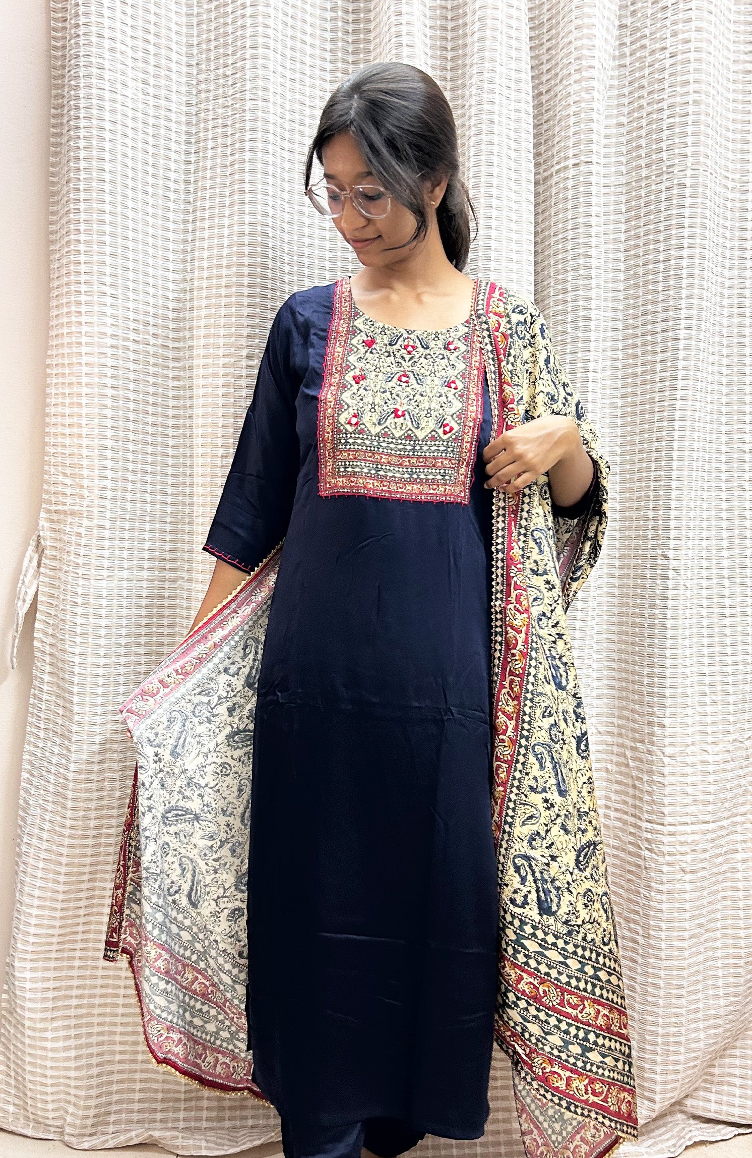 Step into elegance with our Classic 3-Piece Kurthi Set, tailored from premium heavy rayon for a luxurious feel. This set includes a straight-cut top, parallel pants, and a contrasting Gajji silk shawl to complete the look. The top features a U-neckline and 3/4th sleeves, offering both comfort and style, making it perfect for any occasion.
